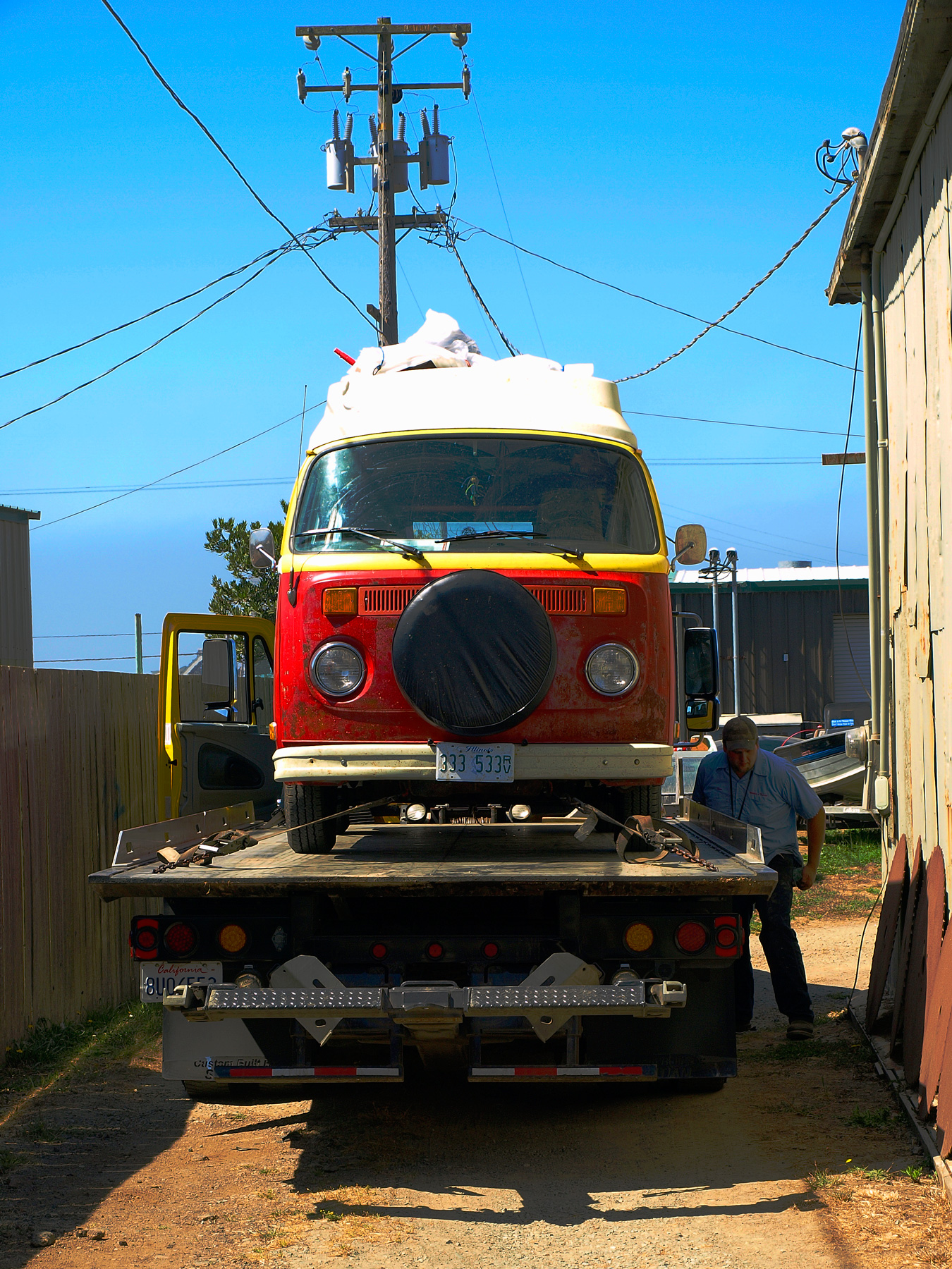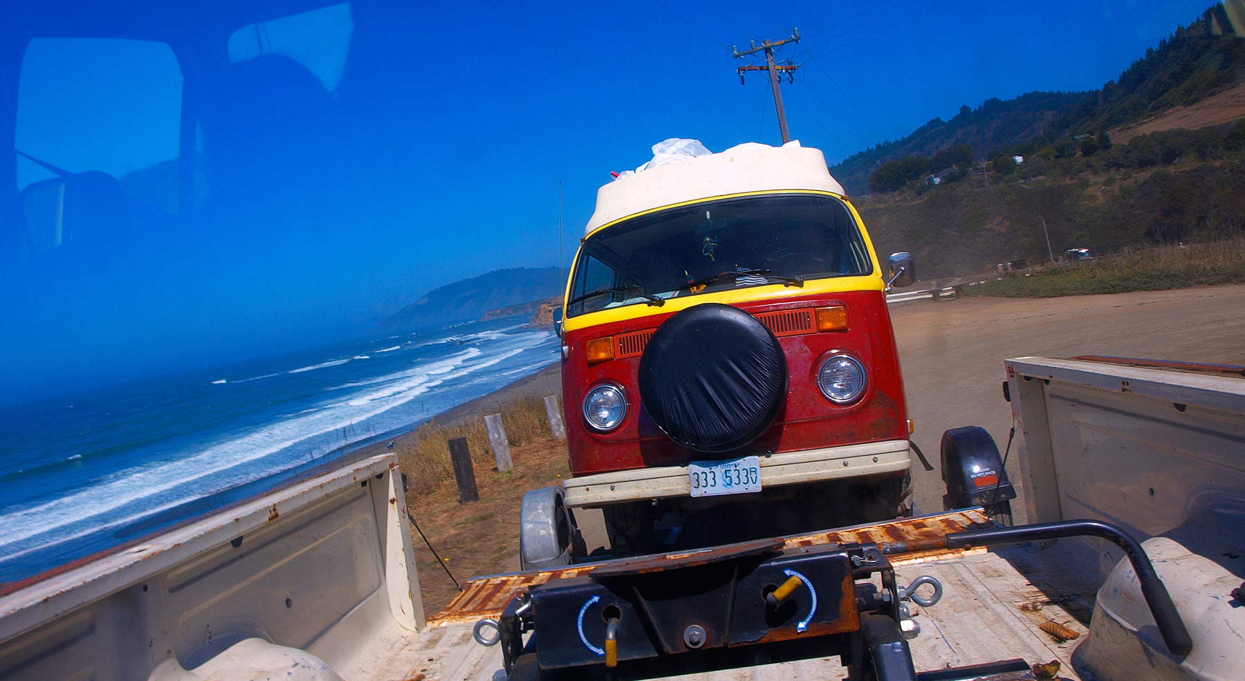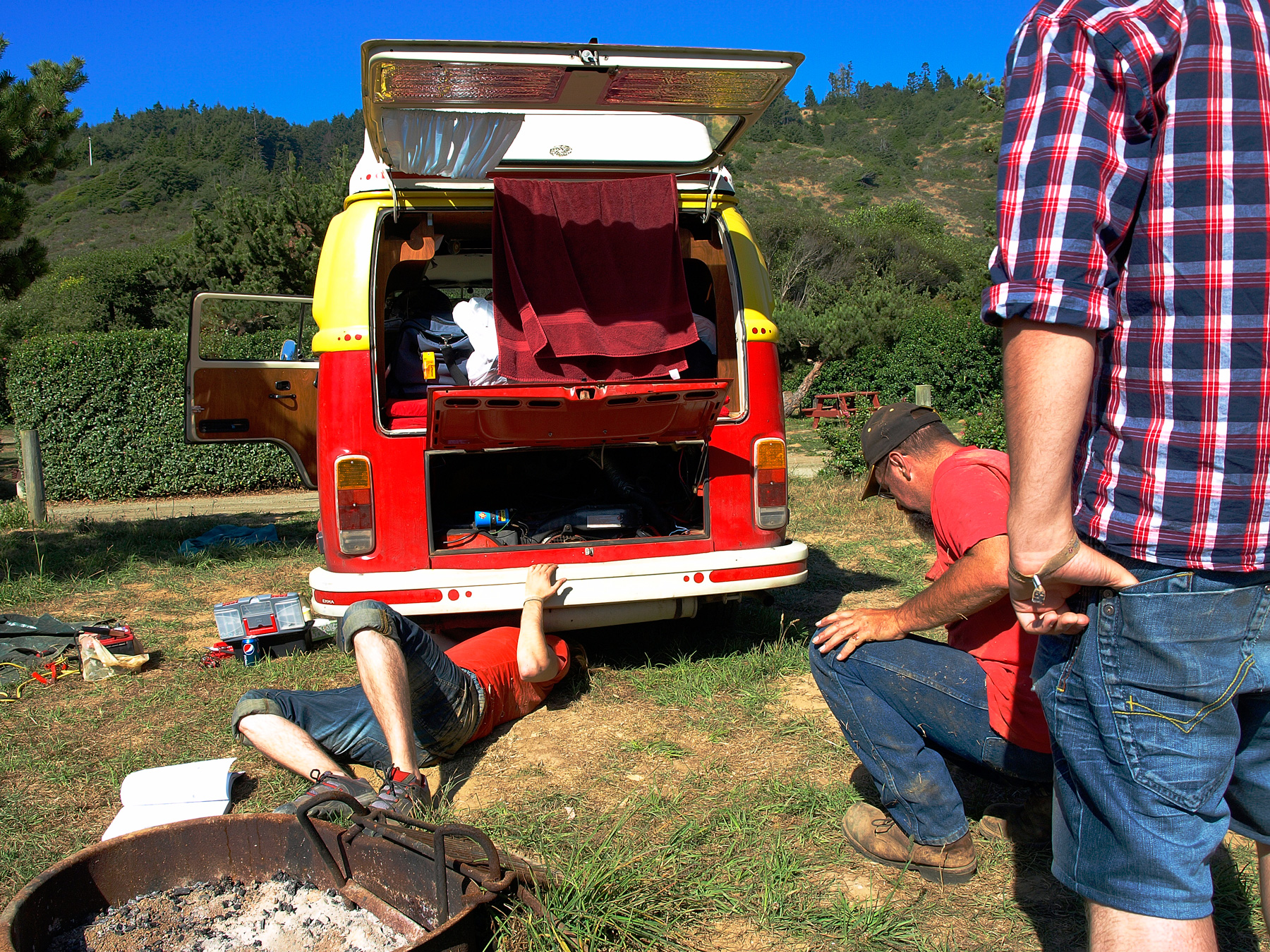 We wake up the next morning and get ready to go. We are a bit slow this time, but we’re not in a rush, so who cares. Sven turns the key and I am filled with sinking despair as the car starts, utters one horrible backfire and dies. F*ck. Not again. Not another day of trying to figure out what is wrong and fixing it again. I hang around and make tea while the guys get under the car, fiddle with things, try to figure it out. Mess with this, mess with that. I’m pretty much just waiting for somebody to come up with a solution. They try the starter again - no luck. A few more times throughout the day - same deal. We come to the conclusion that we can neither fix nor drive it, and a nice fellow offers to tow us to the nearest town - Fort Bragg - to get it looked at.