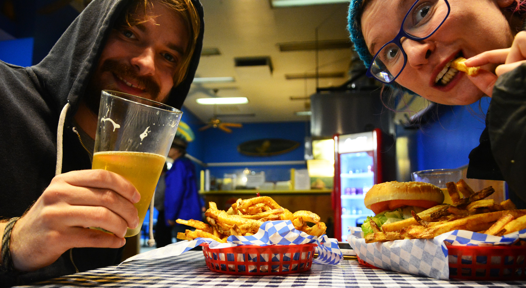 We keep driving, into this beloved stretch of redwood forest. It is gorgeous, and wet, and full of time and history, just like we remembered it. We go on a hike and think, Hey, maybe we can reach the coast? We do, this time, and take some pictures on the beach, and hike back and by then everything we had with us is soaking wet. We get in the car, we drive, we camp. We drive some more, we visit more redwoods. We stop in the town of Eureka and splurge on a burger at a local burger shack for old time’s sake. They are really damn good. We camp, drive some more, heading south looking for warmer climates and sun and the Pacific Ocean.