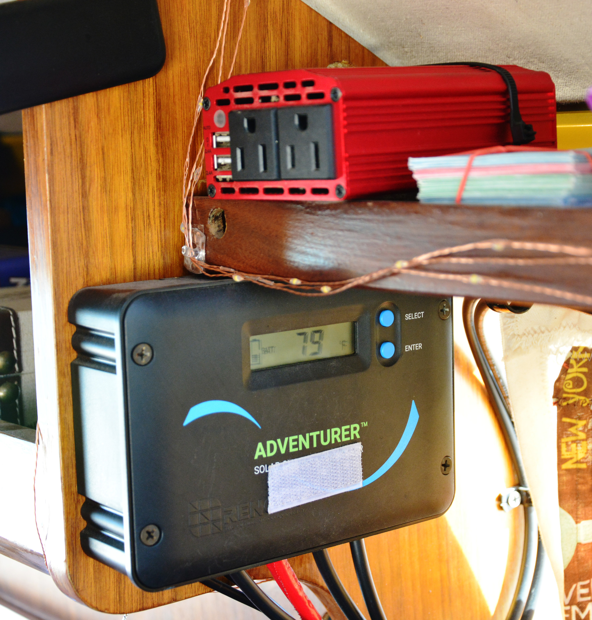 The controller is a little box that goes between the panels and the battery. It’s kind of the manager of the charging process, it converts voltages as needed for the charging, makes sure to stop when the battery is full, and so forth. There are different types of charge controllers available, we opted for the cheaper and slightly less efficient one, a PWM controller (PWM stands for Pulse Width Modulation). Renogy calls this basic model the “Adventurer”.