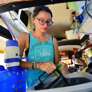 I pump one-_whizz_-two-_whizz_-three-_whizz_-four-_whizz_. Up and down and up and down, as I watch our water bottle slowly fill up. Each pump gives me three more centimeters of water. The sound is almost painful, but I need more, so I do it again. It makes you think the pump is about to break. Lucky for me, I don’t think it will. This is the sound Eduardo, our water-tank, has always made since we installed him back in Illinois. The air I’ve just pumped in builds up the pressure, which forces the water out. As the pressure releases, he extends himself back to his normal height and straightens out. It’s a bit like a fart, one of those slow ones that takes a few seconds to come out. A kind of hiss. But I don’t really want to associate farts with my drinking water, so I paint a mental picture of air being released from a balloon instead as I wait for Eduardo to equalize the air again, and take a refreshing sip of more-than-lukewarm water.