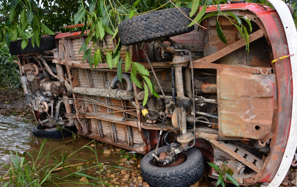 Here we stood, on top of the highway bridge, peeking through binoculars down the river into the underbrush where our camp had been last night. At first, I couldn’t see anything but brown water and vegetation. But then a spark of red caught my eye, shimmering through the brush. And then I saw her. I gasped. Big Emma, our beloved Bus, had moved no more than a few meters from where we had left her. But the water must have risen above her roof, for she was tipped over. Like a dead animal, she was lying on her side, revealing to us her wheels and undercarriage.