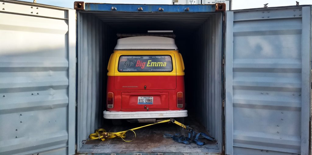 So we waited at the harbor, having procured an over-the-phone promise that we would be meeting our broker there. At 4 PM, he finally showed up. I rushed to cancel Big Emma’s visa while Sven drove her into the container, the whole process exploding in a flurry of stuff that had to be done immediately. For the second time since this story began, I realized I had forgotten to say goodbye to Big Emma. Although I was more confident this time that she wouldn’t be lost to a watery grave, I continued to think of her safety.